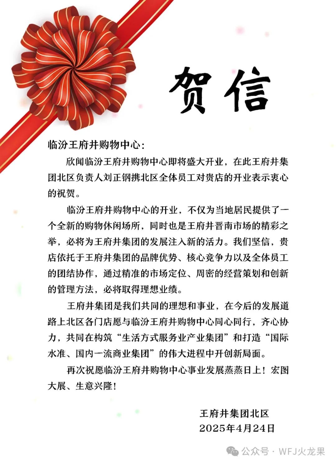 欣闻临汾王府井购物中心正式开业,值此喜庆之际,王府井集团总部谨向你们致以热烈的祝贺!