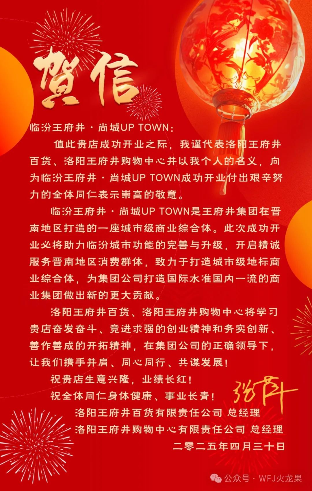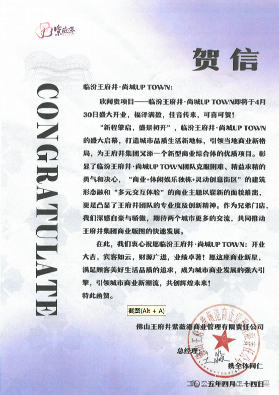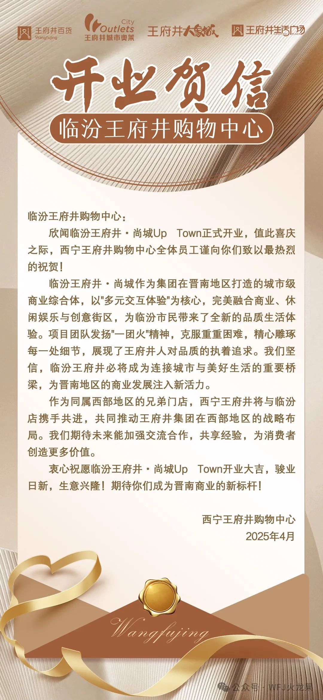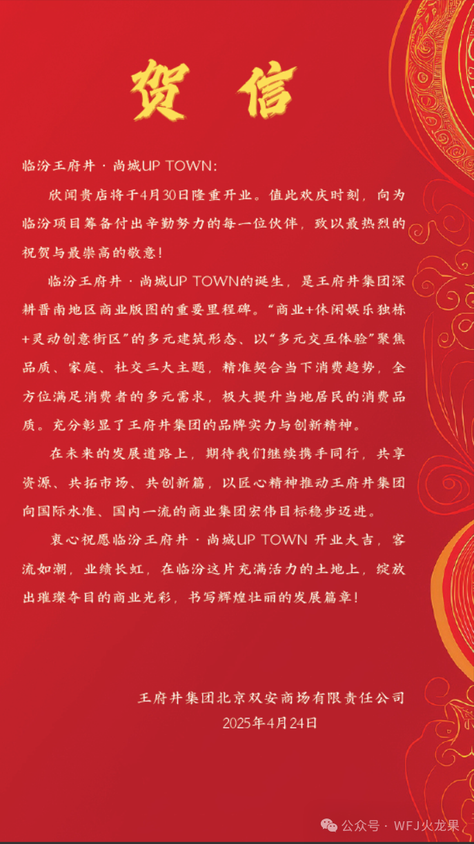 最后,再次祝愿临汾王府井・尚城Up Town开业大吉,骏业日新,生意兴隆!