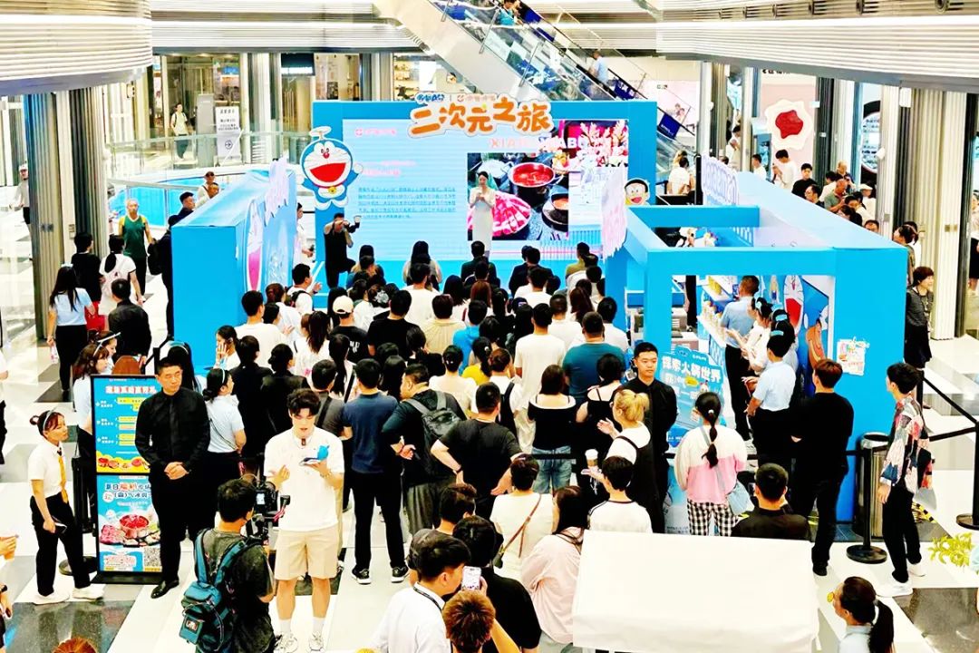 主题快闪活动位于喜悦购物中心一层中庭,集“美食体验+IP沉浸+社交分享”于一体。开幕式结束后,众多顾客涌入这个潮趣空间内,大家打开哆啦A梦的“神奇口袋”,复刻漫画场景沉浸式打卡,品尝夏日主题甜品,选购限定联名周边,特别是“火锅商店”美食区吸引年轻客群参与互动。