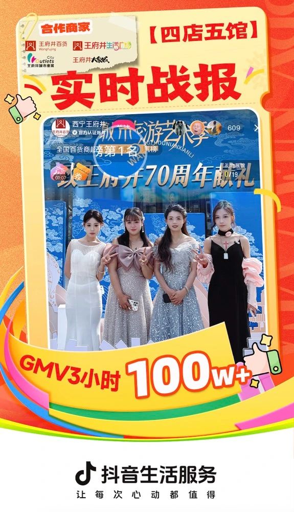 活动中,集团市场与数字运营中心与抖音本地生活部门协作,在西宁中心广场店外搭建直播间开展了本地生活直播。截至7月12日,总成交超380万元,成交券数11976张,成功吸引了消费者到店进行线下消费,通过同城流量扶持,增加了曝光及客流量。众多本地商家借助抖音平台实现销售增长,本地生活抖音账号上榜两项全国第一。