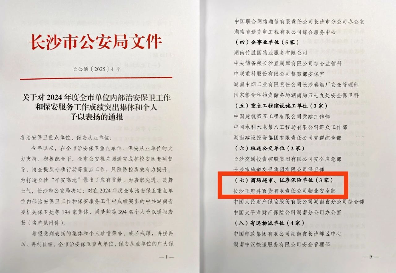 ■ 长沙王府井物业安全部获评“长沙市2024年度全市单位内部治安保卫工作和保安服务工作成绩突出集体”