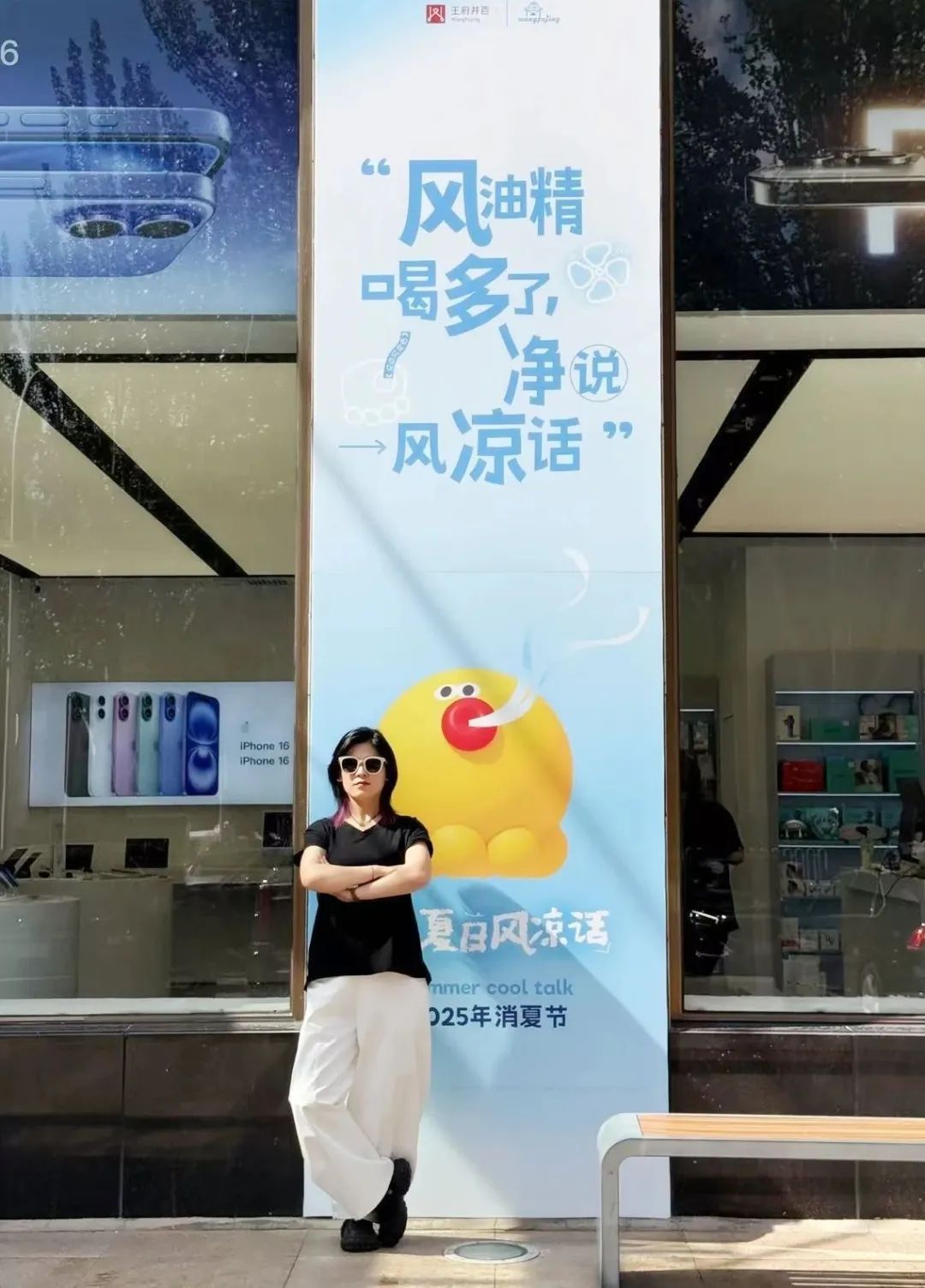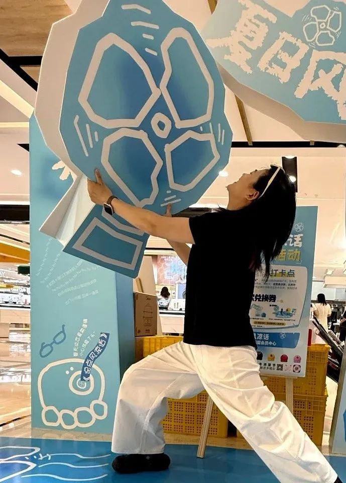 除商品活动外,在商场三个区域打造了“夏日风凉话”主题打卡地:圆弧门广场,利用自带风扇的乘凉椅+会吹泡的泡泡女孩,设置“这里凉快”打卡点,傍晚时分,来这里凉快,享受美好惬意时光;南门入口主通道,利用地贴+KT板+噗噗小章鱼,设置“哪凉快呆哪”打卡点,一步迈向凉感任意门,开启清凉之旅;五层东侧休息区,利用背景条幅+地贴+太空板+冷板凳+噗噗小章鱼,设置“坐坐冷板凳”打卡点,闲逛时刻小憩一下,听听风凉话!进店顾客扫码关注王府井百货公众平台,现场拍照/拍视频打卡并发布即可免费领取“冷饮”兑换券一张,逛街之余来杯冰凉下午茶,惬意十足!
