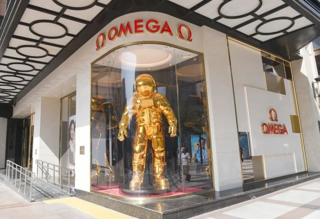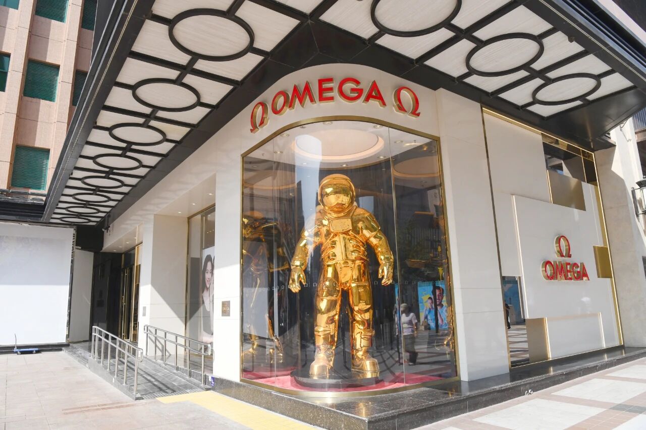 此次欧米茄百货大楼店移位重装开业,多维升级:一是占据王府井步行街临街的优越位置,品牌形象更加突出;二是打造出品牌最高级别旗舰店形象,经营面积扩展至146平方米,陈列展出超霸、星座、海马、碟飞四大系列的经典与畅销表款;三是店内增设维修中心,集销售与售后服务于一体,为顾客提供优质服务。尤为引人注目的是,新店拥有中国大陆地区首座金色宇航员雕塑,其整体采用玻璃钢制作,内部使用金属支架做结构支撑,表面为电镀钛金效果,这座3.6米高的艺术品已成为王府井大街的标志性打卡点。