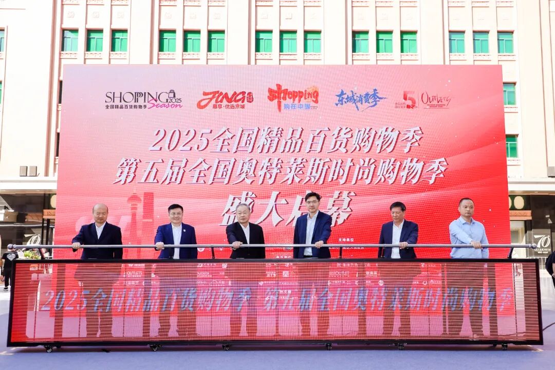 在热烈的掌声中,启动嘉宾共同登台推动启动杆,“2025全国精品百货购物季”“第五届全国奥特莱斯时尚购物季”正式启幕。