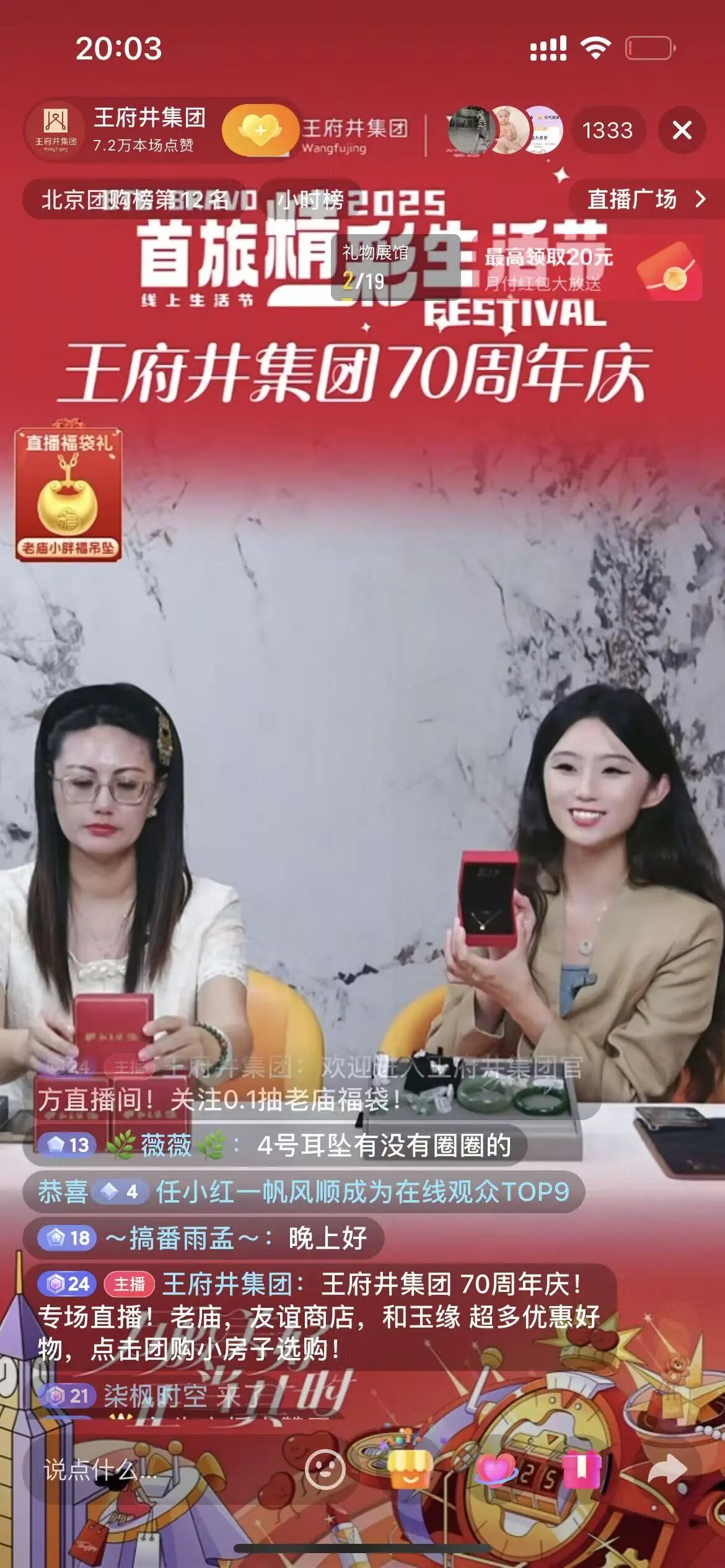 王府井集团助力首旅线上精彩生活节,于9月12日至13日推出珠宝与运动户外两场垂类专场直播,期间总GMV突破100万元,总曝光量超95万次,近百万用户通过抖音平台关注到王府井集团的70周年庆福利,进一步扩大了品牌在年轻消费群体中的声量。