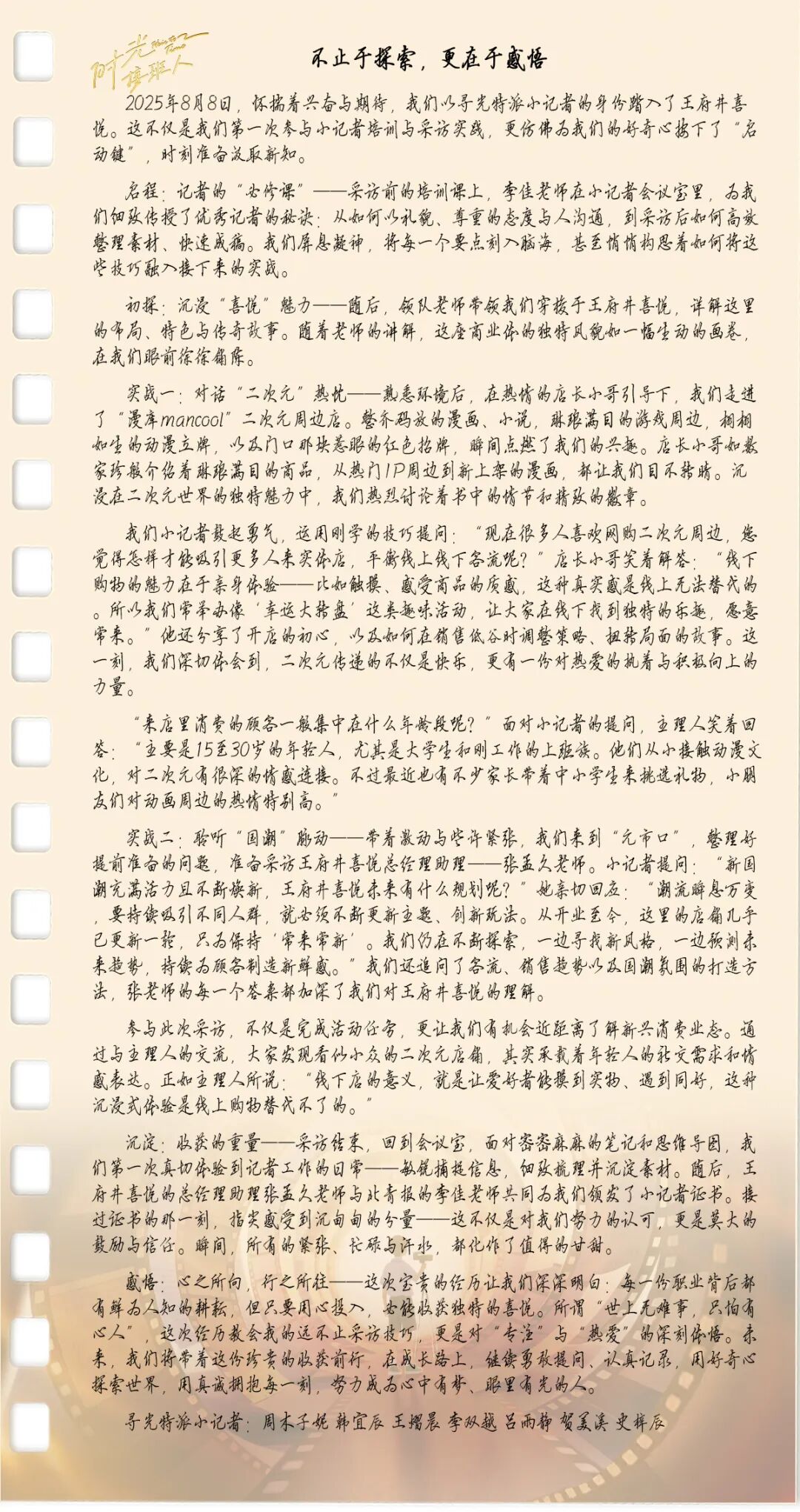 会合分享时,小记者们提到最多的词就是“次元文化”“新潮”与“创新”。此次活动既为青少年提供了认识北京在地文化的实践课堂,更展现了王府井集团从传统商业向现代生活方式平台转型的战略布局。