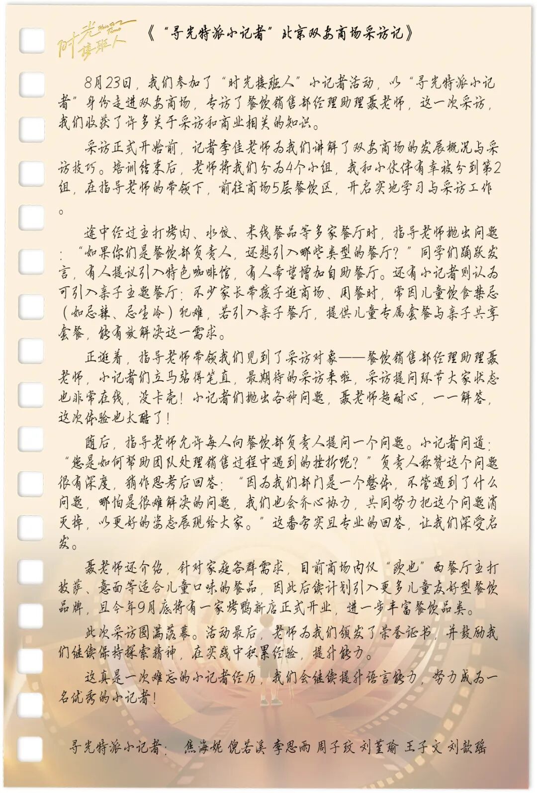 由王府井集团、北京日报报业集团主办,北京青年报新媒体有限公司承办的“时光接班人・一路童行话时光”小记者活动日前落下帷幕,活动邀请约120位青少年以“时光接班人”的身份探访北京地区四家门店。小记者们在北京市百货大楼深入挖掘一团火精神的起源与发展,在王府井喜悦解锁新国潮文化与商业密码,在双安商场探索商业项目焕新之路,在王府井奥莱·香江小镇体会生活美学新范式。本次活动不仅搭建起王府井集团与青少年之间的的时光桥梁,让“一团火精神”与商业嬗变价值内核得以代代传承。