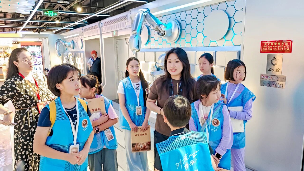 百货大楼员工张阳向小记者们讲述了“新中国第一店”的辉煌历程,重点介绍百货大楼从传统百货向融合国际时尚、京味文化体验与前沿数字艺术的现代化商业体转型之路,使小记者们对百货大楼大楼的传承与创新有了初步认识。