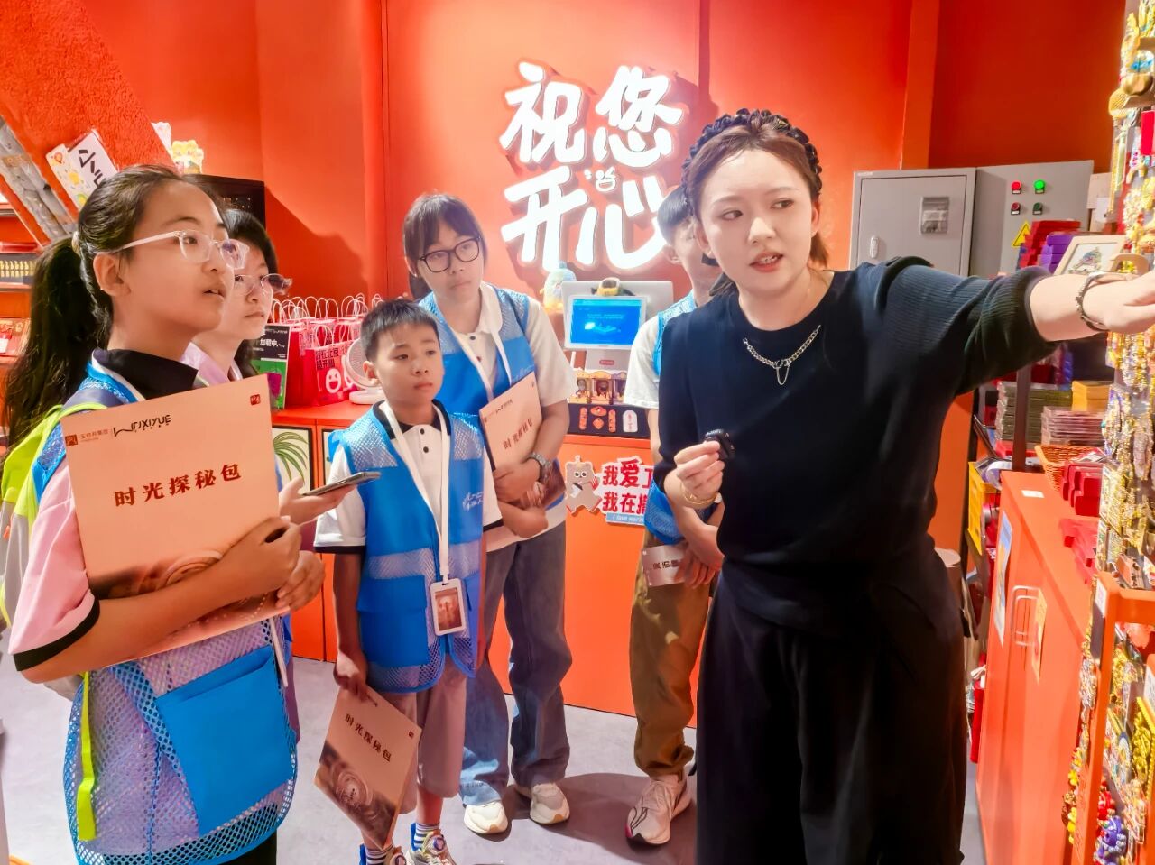 在喜悦新国潮主题空间“XY头条”和其中的二次元主题街区,漫库店长为小记者们逐一介绍店内各大IP背景及文化,国风元素与潮流次元商业的完美融合,令小记者们惊叹不已。在文创街区“京物志”和“开心实验室”,小记者们探索文创产品的设计创意,感受次元带来的快乐,在采访中领悟“文化美学”。