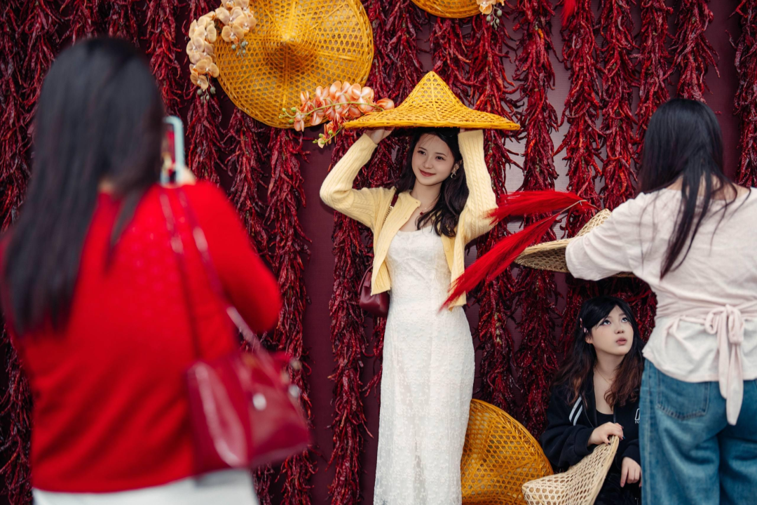作为本次活动的标志性亮点,外场以7000根红辣椒编织的“我在长沙,我爱祖国”辣椒旗帜,吸引大量市民与游客驻足打卡拍照,迅速在社交平台掀起传播热潮。不少消费者表示:“辣椒墙不仅好看,更象征着咱们长沙人民热辣的生活态度!”