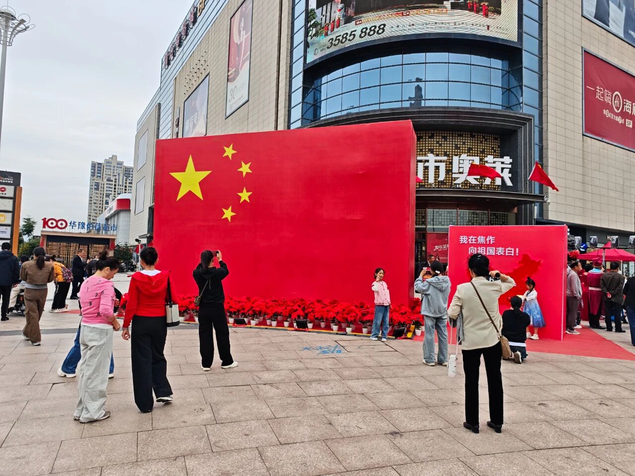 焦作王府井城市奥莱将国庆爱国情怀与中秋传统文化深度融合,策划推出“嗨玩国庆·乐享中秋”主题活动。商场外广场正门处,一面庄严的巨幅五星红旗搭配祝福祖国打卡墙,传递出对祖国的深情祝福,吸引不少市民带孩子来感受家国情怀,此处也迅速成为市民记录双节美好时刻的热门地标。商场外广场舞台好戏连台,“家国同庆”主题红歌会接连上演,《我和我的祖国》《歌唱祖国》等激昂红歌与《但愿人长久》《月亮代表我的心》等经典老歌,激发了市民的情感共鸣。
