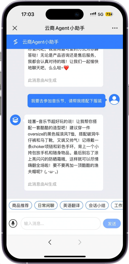 顾客若想要户外音乐节上衣,智能体除推荐印花短款 T 恤外,还会搭配相关产品,并附上穿搭效果图,让顾客直观感受搭配效果......用这样一个全面而直观的案例,上市公司王府井(SH600859)为我们描绘了在智能体超能力加持下“AI+零售”的新图景。