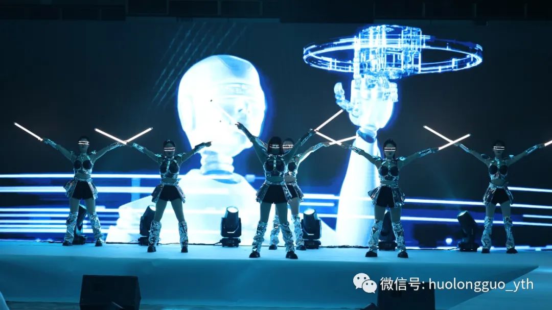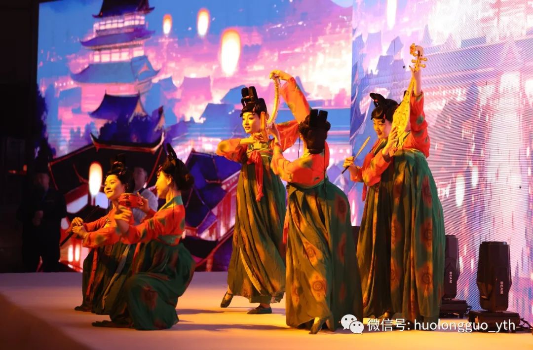 19:00,定场钟响起,全场暗场,朝代秀“夜宴时光之约”拉开帷幕,在黑暗中。竹林摇曳中,一轮明月缓缓从竹林中升起,几艘渔船上的渔火明灭之间,编钟和悠长的笛音响起,十位身着战国锦袍的演员向嘉宾施以最高礼仪,展示大汉盛世的兴盛与繁华。随着一曲悠扬的《长恨歌》古调,六位一袭红绿“撞色”唐代齐胸襦裙的舞蹈演员,演绎了女乐官“唐宫夜宴”的趣事;八位身穿未来科技感服饰的舞者带来一场光影炫舞,传统文化与时尚潮流交织。