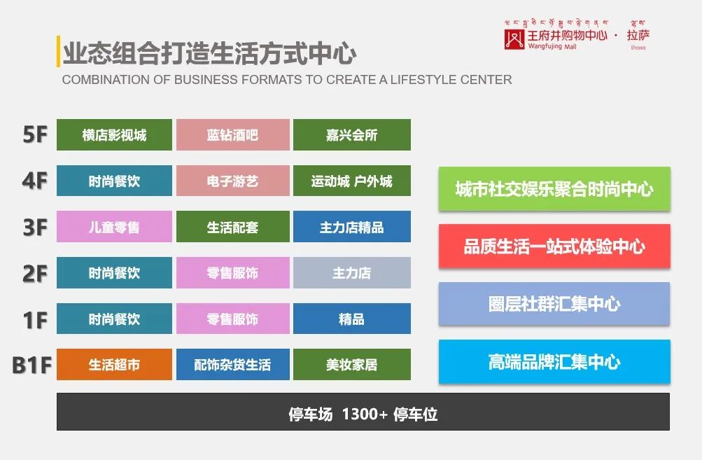 截至目前,拉萨王府井购物中心藏地首进品牌已达68个。整体招商率超90 %。主力店:百益精品超市、横店影城、华为智能生活馆、宝贝王、玩派电玩城、嘉兴会所、壹号健身、梦之蓝电竞等。